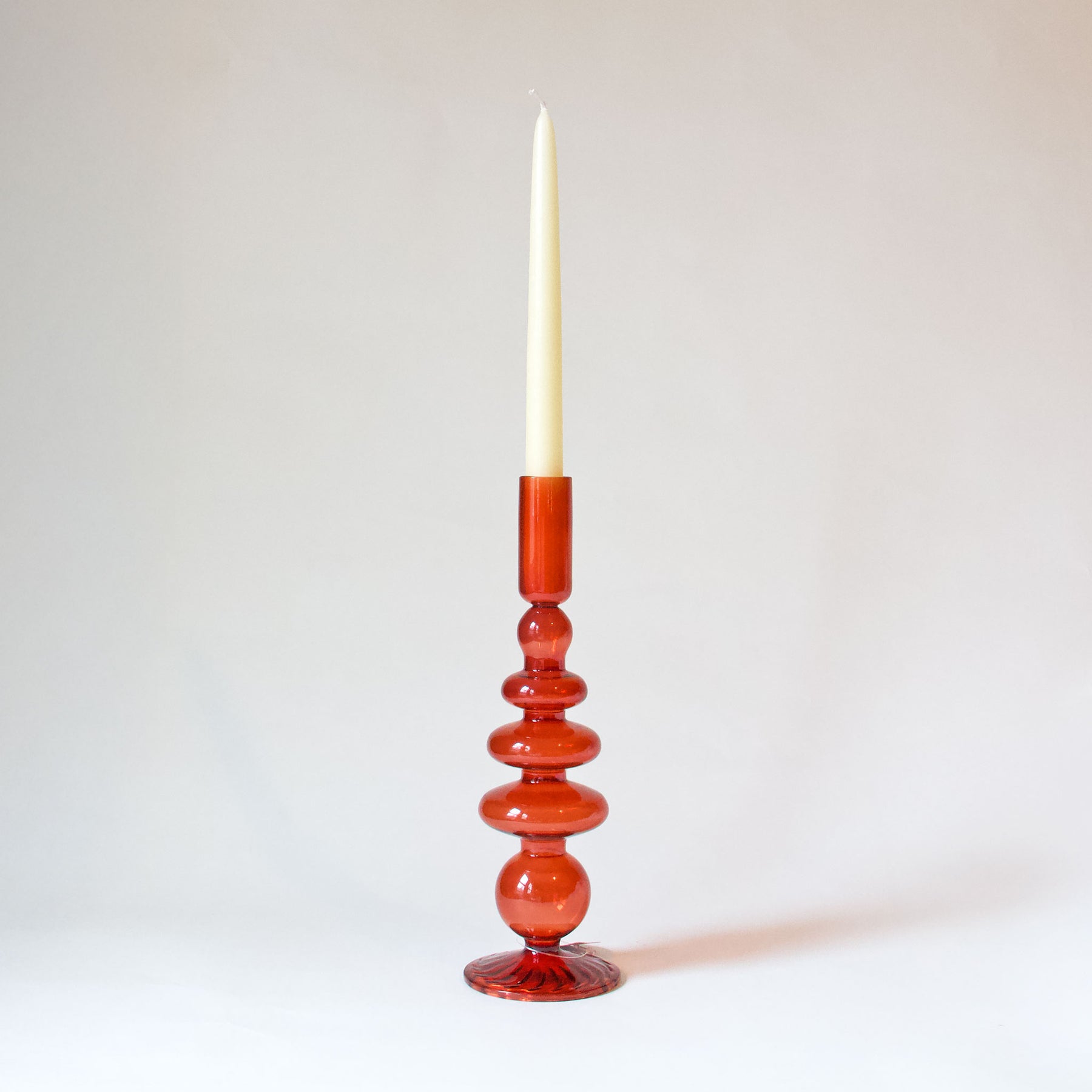 This sculptural glass taper candleholder, with its bubble geometric shape and rich red hue, brings main character energy and deserves a central place in any home. While beautiful alone, these pieces also create a stunning centerpiece when arranged with glass taper candleholders of varying styles and heights. Place them along your dining room table, atop your mantel, or on your coffee table for striking contrast in color, shape and texture.