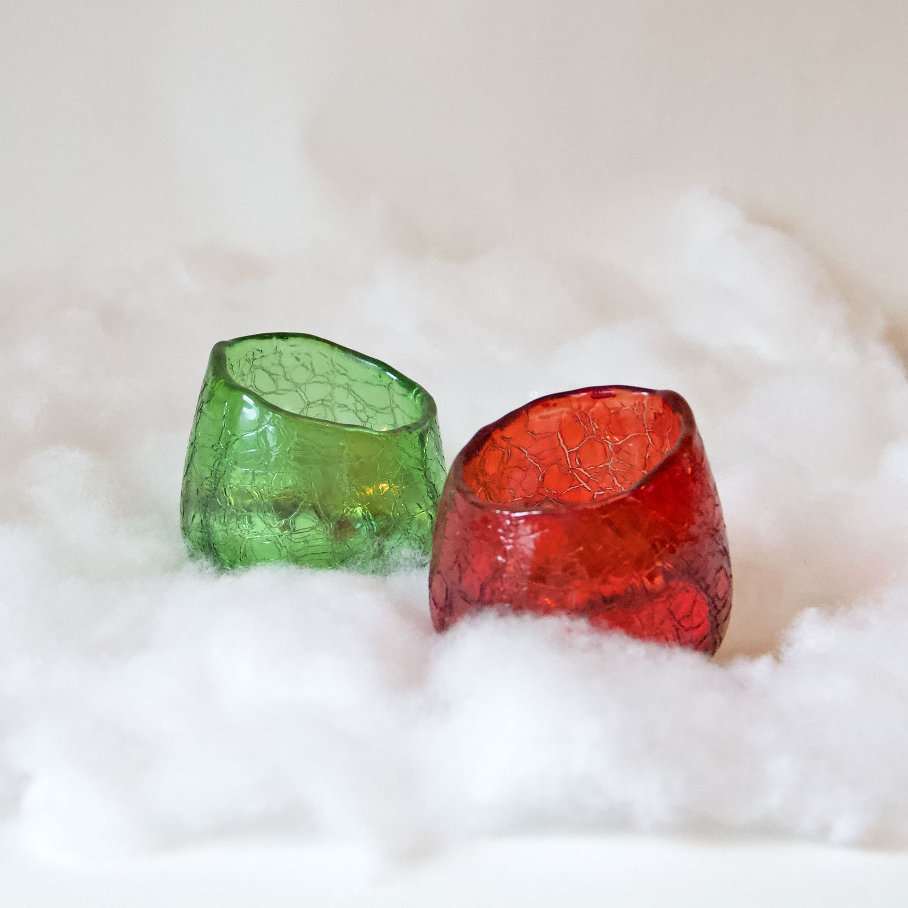 Twinkle, twinkle! These red glass tealight candleholders have a unique crackle finish and give off the warmest and most festive light. Pair them with the matching red candleholders, or with contrasting taper candleholders for a full holiday look.
