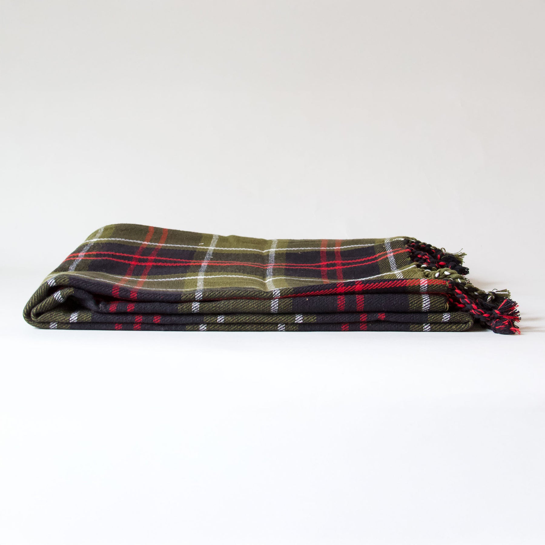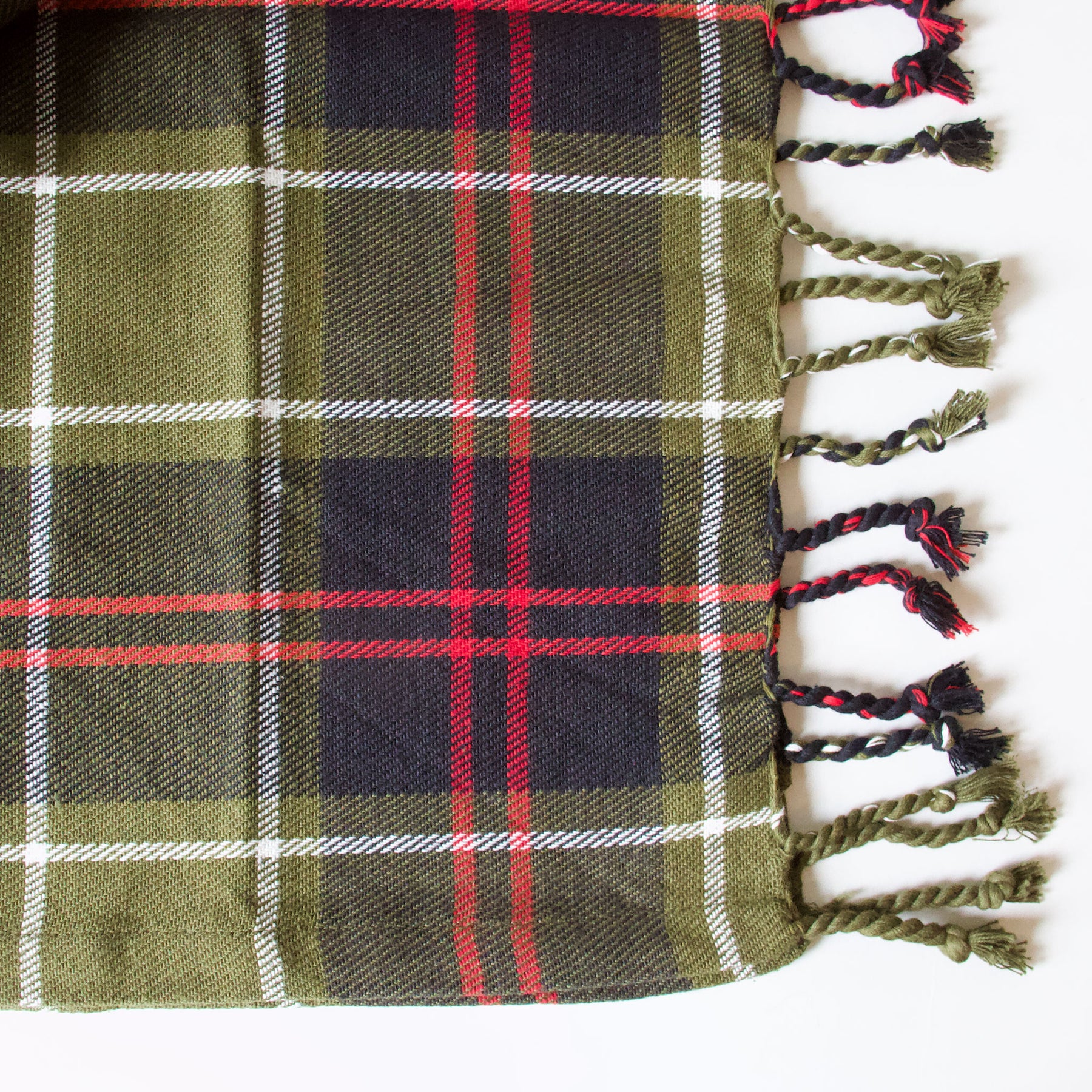 A deep green color and plaid pattern make this cotton throw a perfect holiday accent. Pair it with deep reds and whites for a cozy and festive feel.