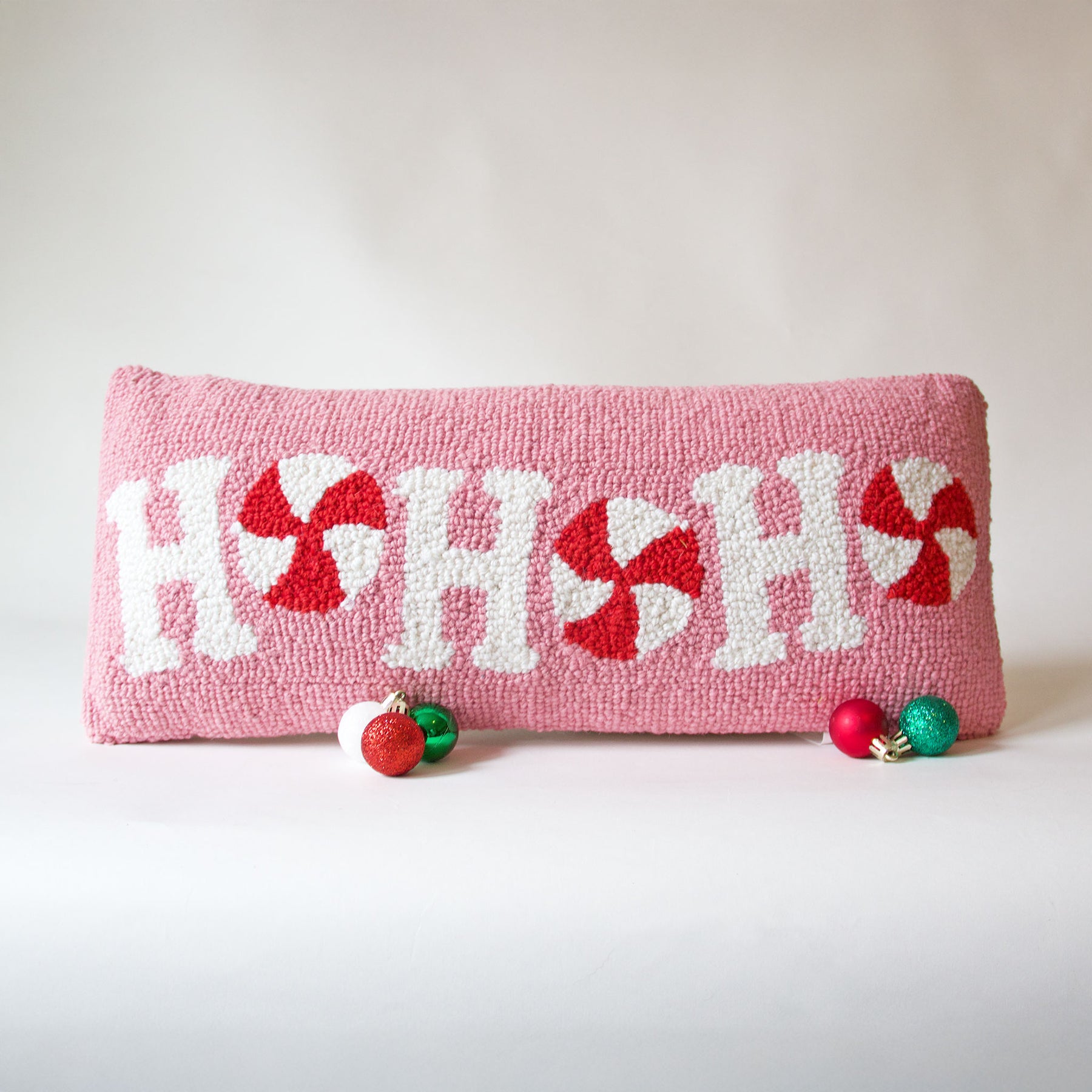Add a fun little touch of Christmas to your living room with this Ho Ho Ho pillow. Its pink color and peppermint pattern make it a playful accent for your holiday decor.