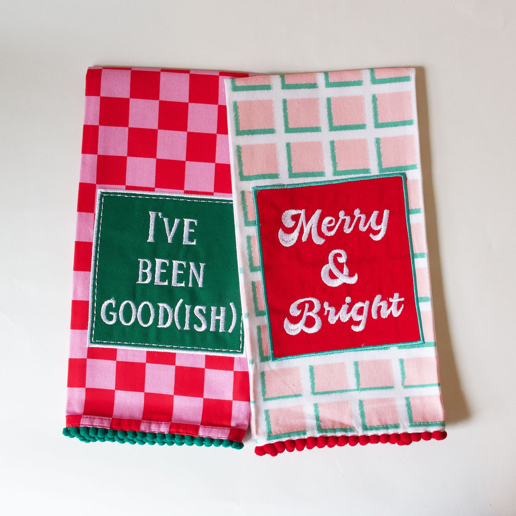 Add a touch of holiday cheer to your kitchen with this tea towel. With a pink and green windowpane pattern, Merry & Bright patch, and red pom poms, she's both classic and modern.