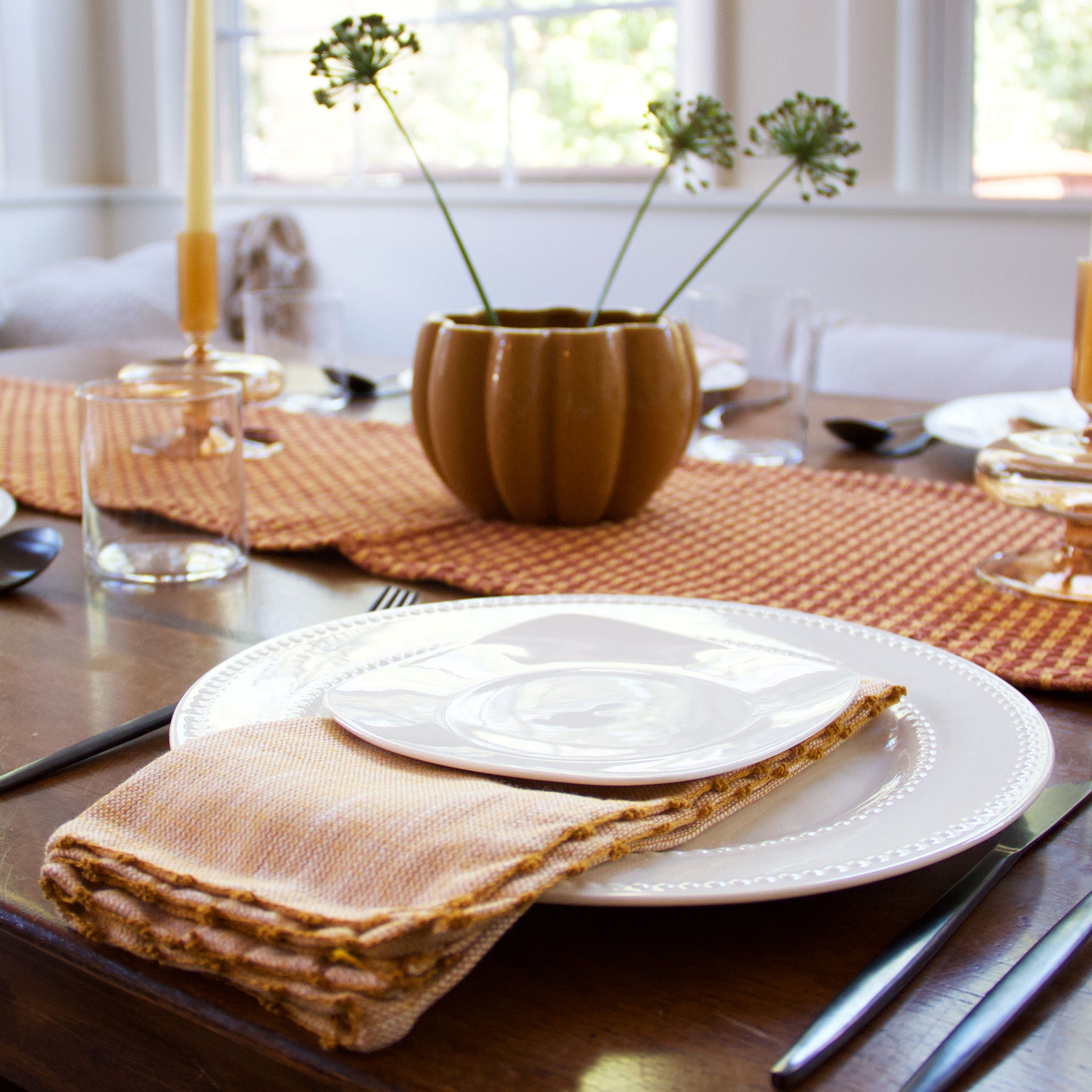 When planning out your dining room table decor, linens are key and can make or break your entire tablescape. Coordinate your napkins with your placemats and runner for a cohesive, unified aesthetic, set your napkins apart as the focal point and keep the other elements muted for a themed dinner, or incorporate contrasting patterns and textures for an eclectic vibe. Whatever your style, keep cloth napkins on hand, throw 'em in the washer when the meal is over, and worry about something else.